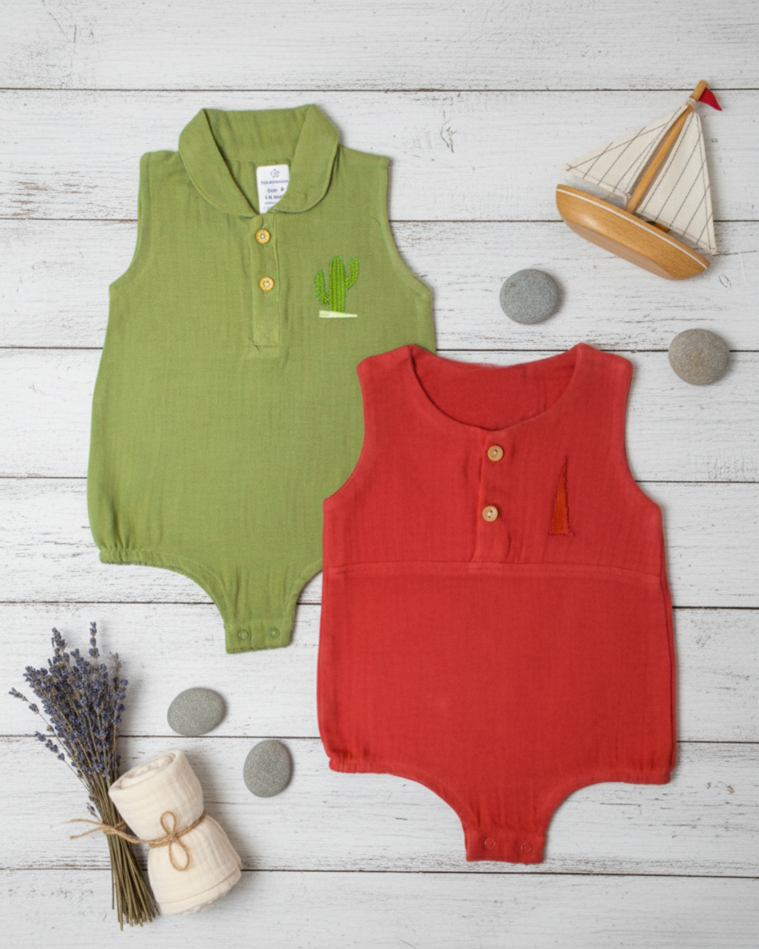 This unisex romper combo includes a brick red piece and a green piece, both made from 100% soft muslin cotton. The breathable fabric keeps your little one cool and comfortable during summer, while the elegant embroidery on the left chest and stylish sleeves add a charming touch. Perfect for playtime, naps, or outings, this combo combines comfort, style, and practicality for everyday wear.