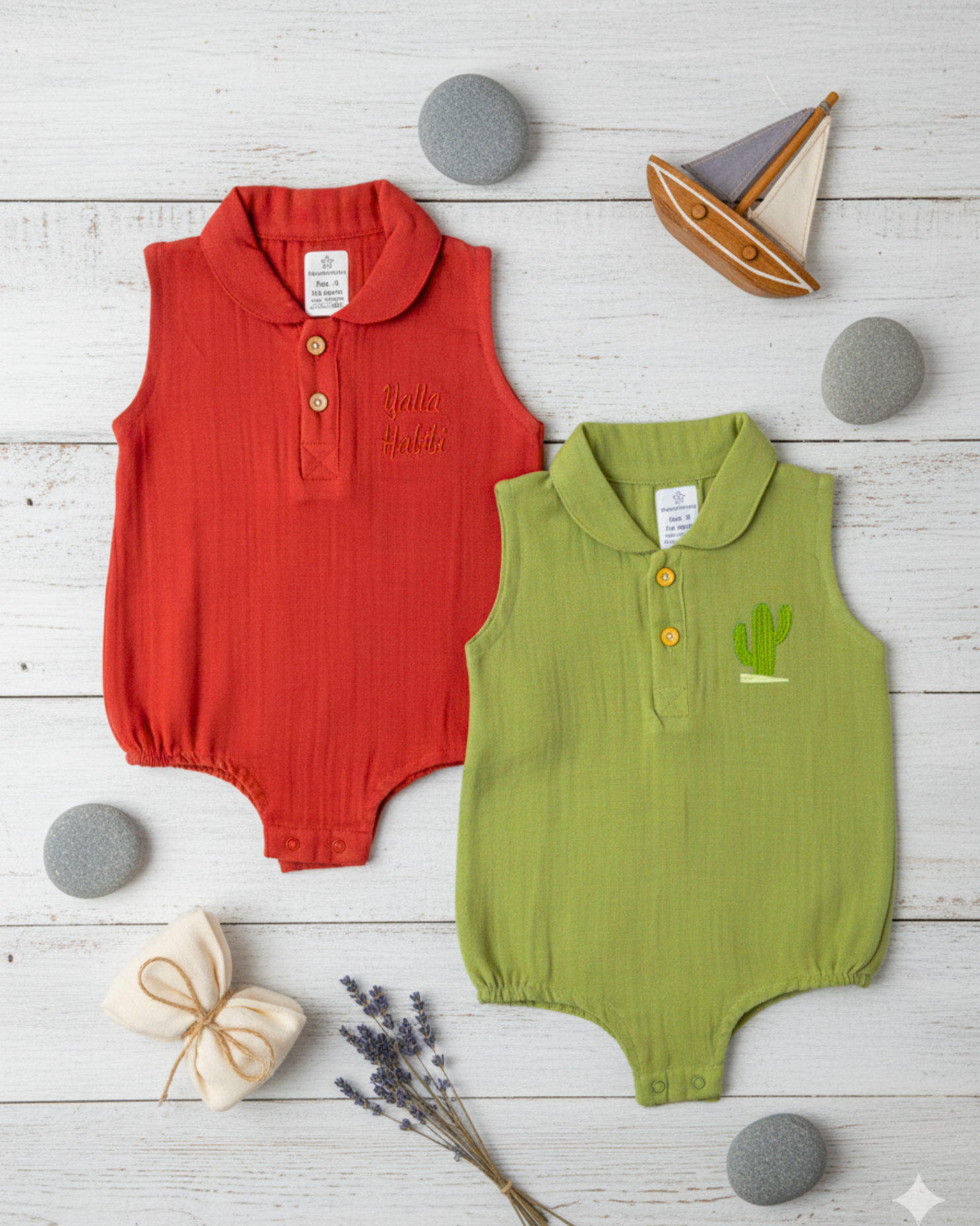 This unisex romper combo includes a brick red piece and a green piece, both crafted from 100% soft muslin cotton. The breathable fabric ensures your little one stays cool and comfortable during the summer, while the elegant embroidery on the left chest and stylish sleeves add a charming touch. Perfect for everyday wear, playtime, naps, or outings, this combo combines style, comfort, and practicality for your baby’s wardrobe.