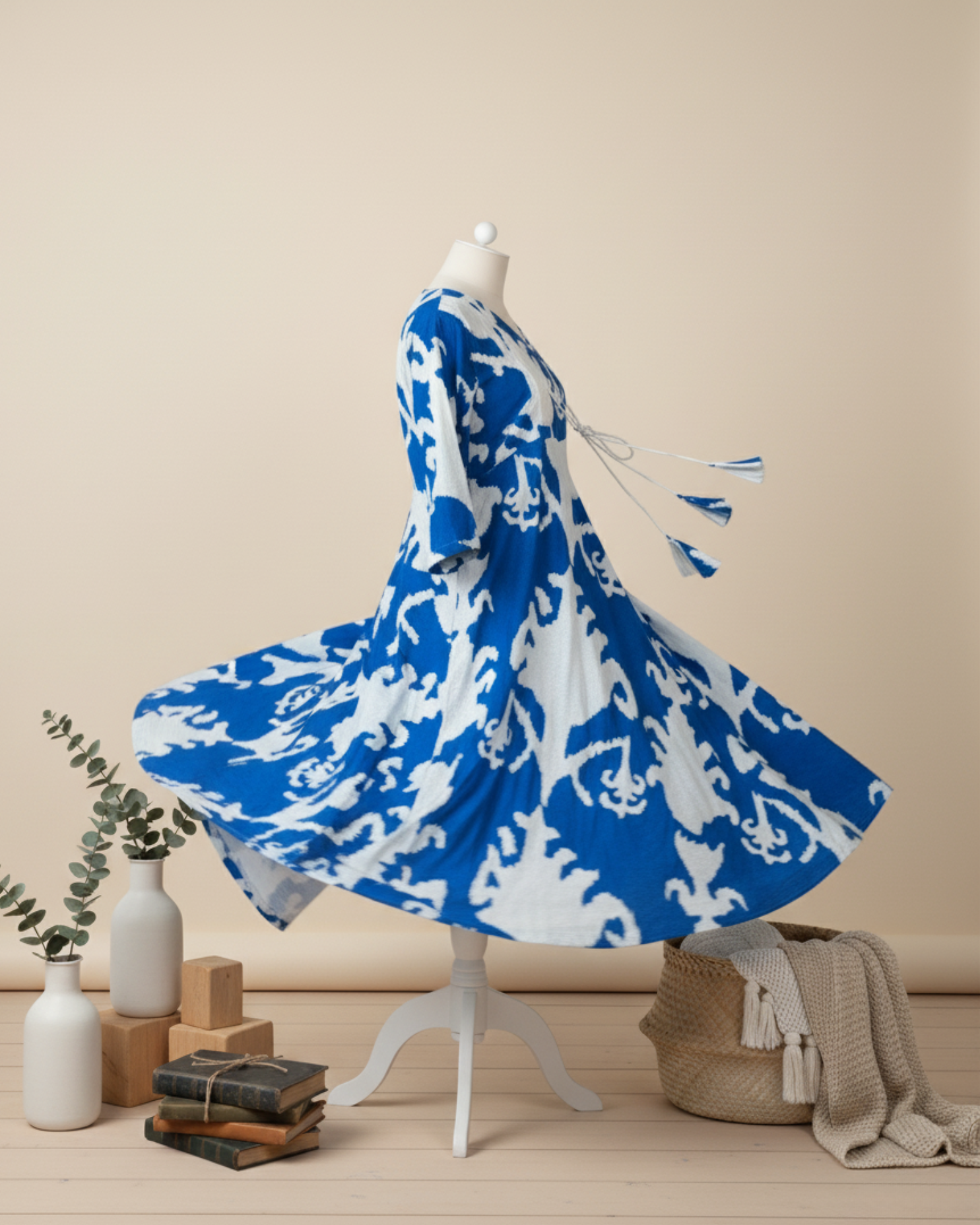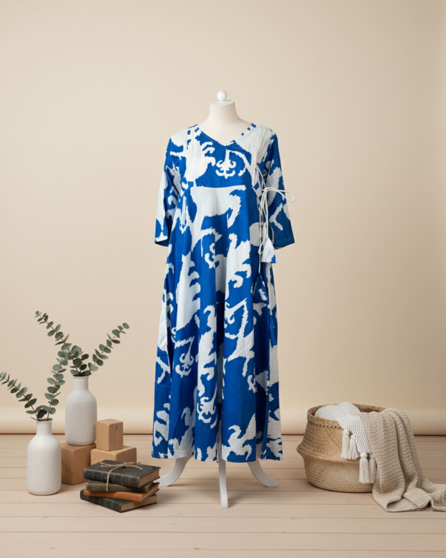 Our elegant Maternity Angrakha Dress is crafted from pure cotton for a soft, breathable, and lightweight feel. Featuring a beautiful blue and white block screen print, this dress combines traditional charm with modern practicality, making it a must-have for every mom-to-be.