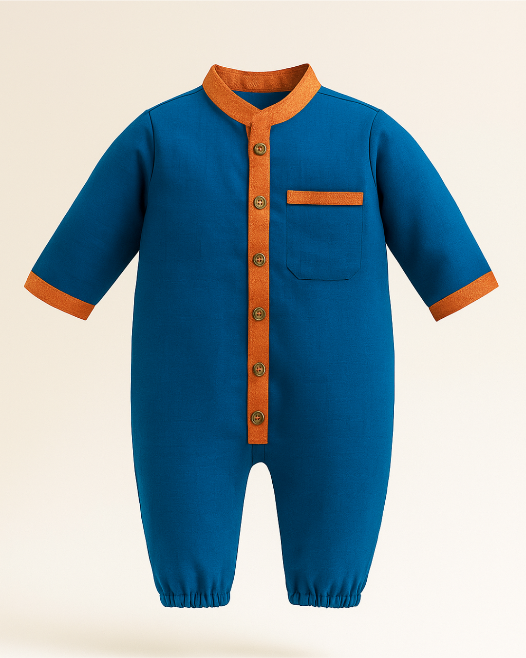 For parents who love the charm of traditional attire with a modern twist, our Blue Ethnic Romper is the perfect choice. Designed with elegant gold detailing and crafted from soft cotton with a comfortable inner lining, this romper ensures your little one stays stylish and comfortable throughout the day.