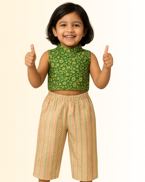 ✨ A stylish green & multicolour festive co-ord set that perfectly blends comfort, elegance, and modern ethnic charm for your little one!