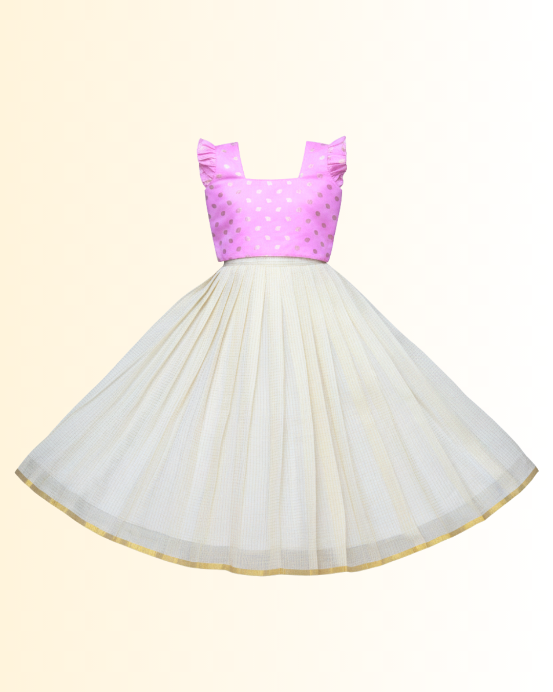 A beautiful traditional set featuring a checked kasavu tissue skirt paired with a pink brocade crop top. Both the top and skirt are thoughtfully lined with soft cotton for all-day comfort. This charming outfit perfectly blends classic elegance with festive flair, making it an ideal choice for Onam, Vishu, weddings, or any traditional celebration.