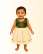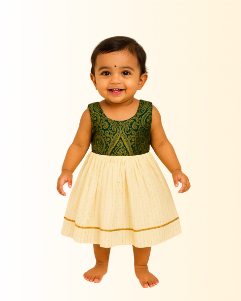 A graceful Kasavu frock featuring multicoloured lace detailing at the bottom, paired with a rich green brocade chest design. The frock is designed with extra gatherings for added volume and a soft cotton lining to ensure all-day comfort. Perfect for festivals, weddings, and special occasions, this piece blends traditional elegance with style.