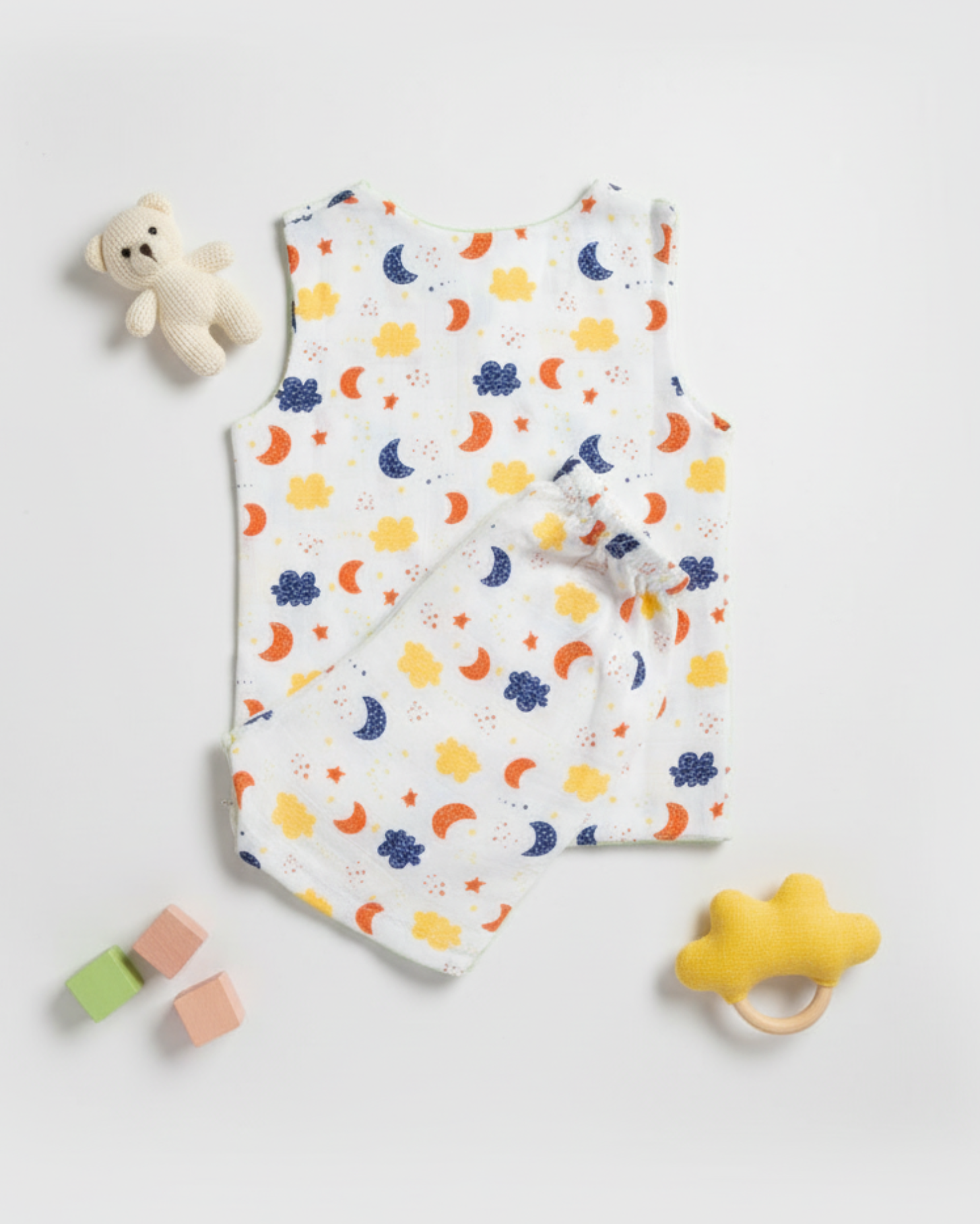 This adorable two-piece set includes a soft jabla (top) and comfy shorts, made from 100% premium muslin cotton. The lightweight and breathable fabric keeps your little one cool, comfy, and happy all day long. Perfect for summer days, outdoor play, or casual outings, this set blends comfort and cuteness effortlessly — making it an essential for your baby boy’s wardrobe.