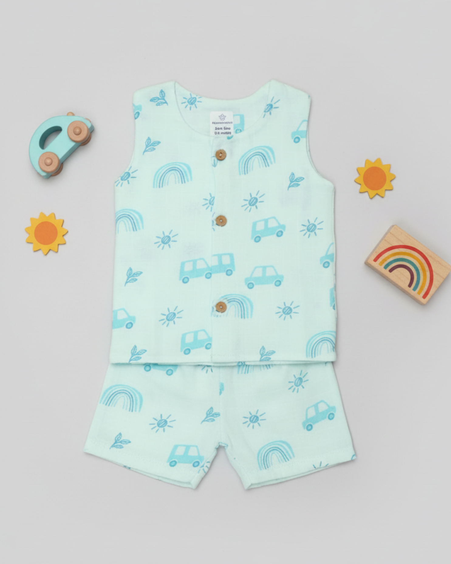 This adorable two-piece set features a soft jabla (top) paired with comfy shorts, designed to keep your little one cool and comfortable all day long. Made from 100% pure muslin cotton, the fabric is lightweight, breathable, and gentle on delicate skin — perfect for warm days, outdoor play, or casual outings. Stylish, practical, and super soft, this set is a must-have for your baby boy’s everyday wardrobe.