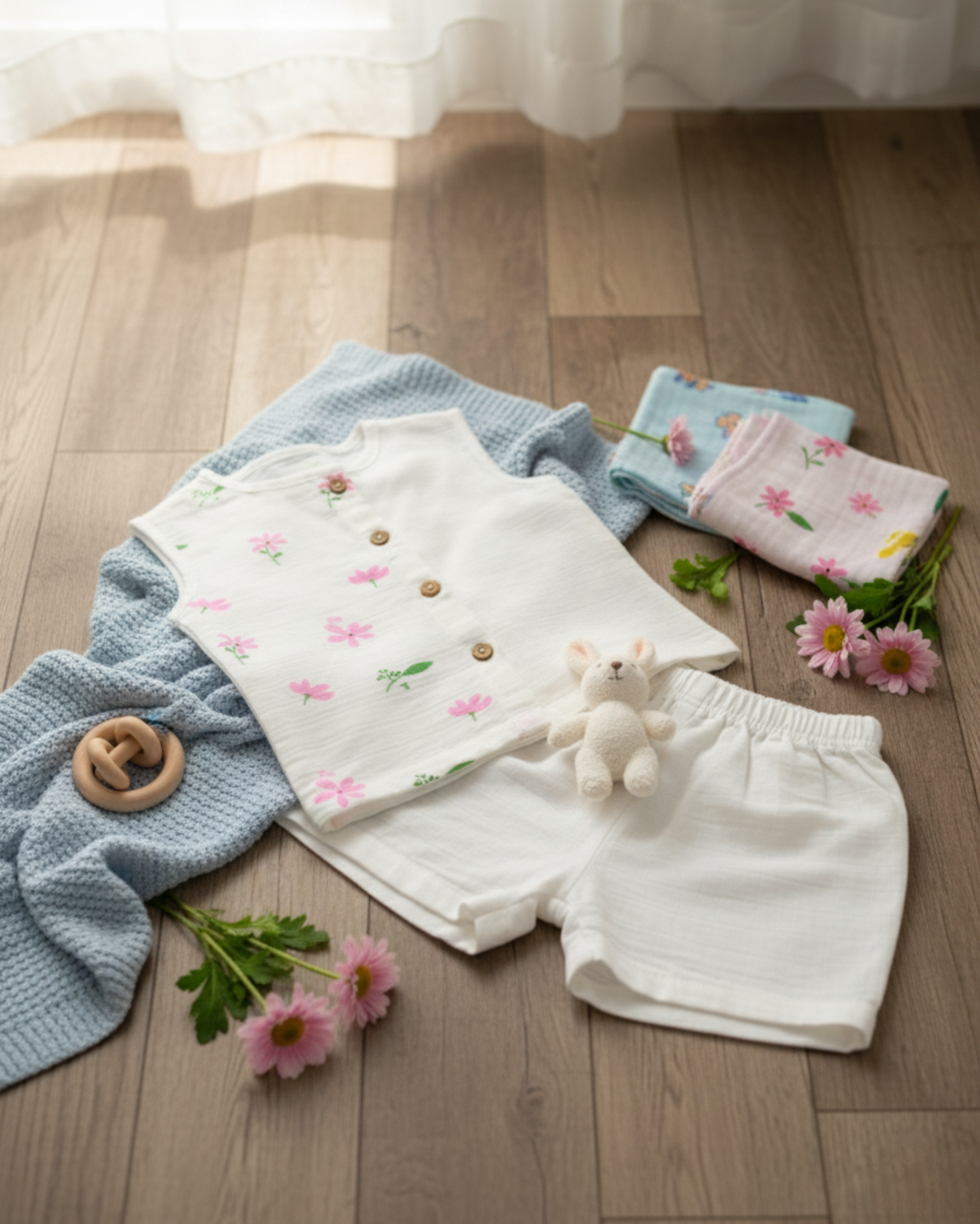 This Organic Cotton Muslin Boys Jabla and Shorts Set combines comfort and style for summer outings. The jabla features a playful one-side print, while the crisp white shorts add a fresh and cool touch. Crafted from breathable organic cotton, this set is soft, lightweight, and gentle on delicate skin—keeping your little one comfortable and stylish all day long.