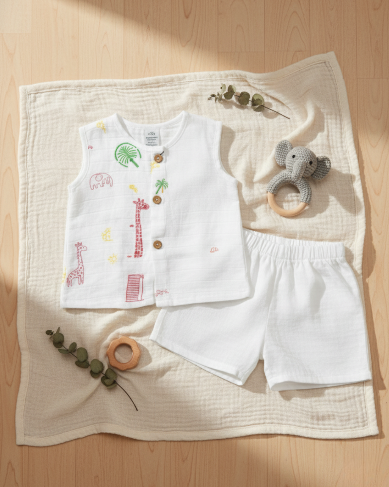 The Golden Dunes Organic Cotton Muslin Boys Jabla and Shorts Set is the perfect blend of comfort and style for summer. The jabla features a playful golden-toned print on one side, paired with crisp white shorts for a fresh, breezy look. Made from 100% organic muslin cotton, this set is soft, breathable, and gentle on delicate baby skin—keeping your little one cool, comfortable, and stylish all day long.