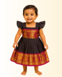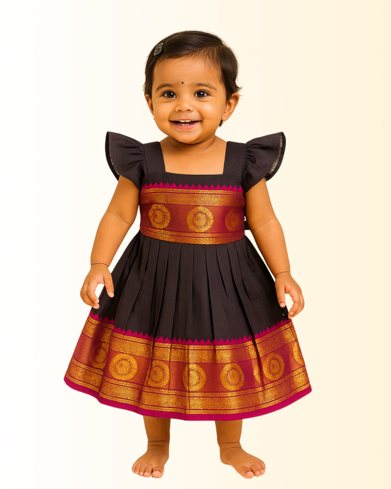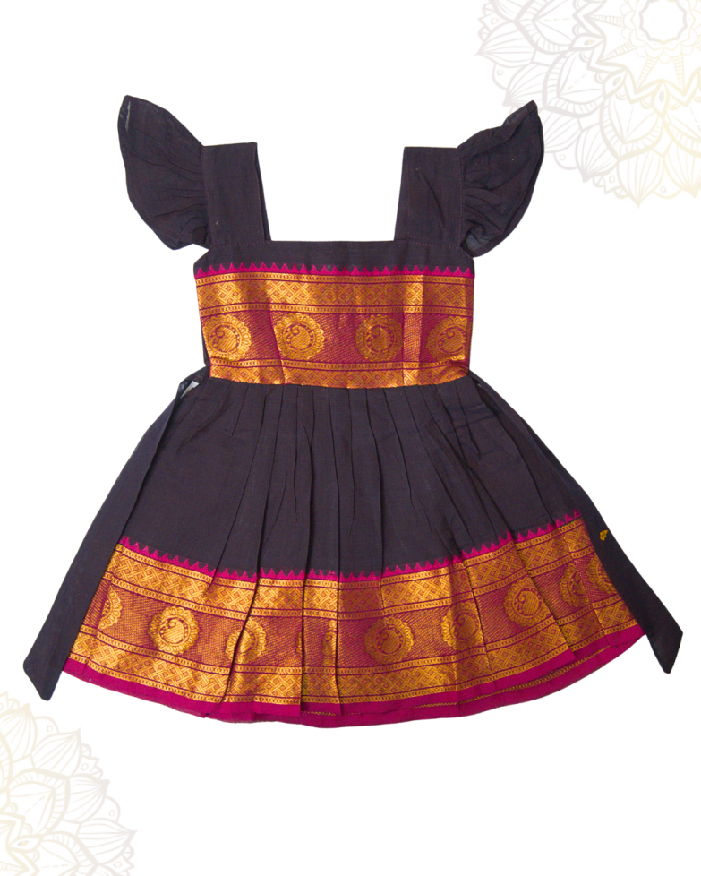 A charming dark purple kanchi cotton frock featuring elegant ruffle sleeves and a beautiful border on the chest that adds grace to the design. The soft cotton lining ensures all-day comfort, making it perfect for festivals and special occasions. This frock seamlessly blends traditional aesthetics with modern comfort.