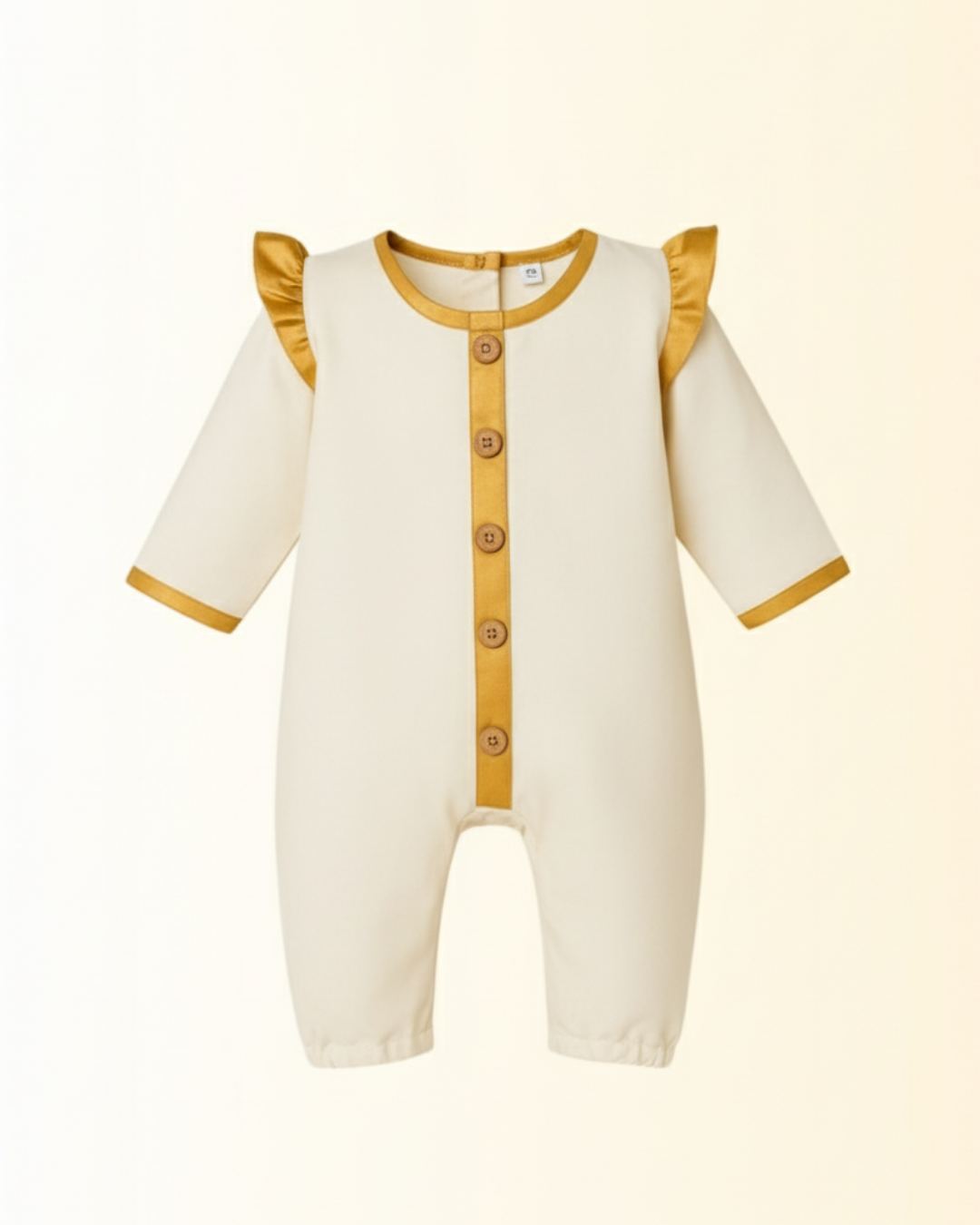 Celebrate traditions in style with our White Kasavu Romper, crafted from soft cotton with a smooth cotton lining for ultimate comfort. Adorned with delicate golden frills on the shoulders, this romper is the perfect outfit for your little one on festive occasions like Onam, Vishu, and family gatherings.