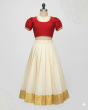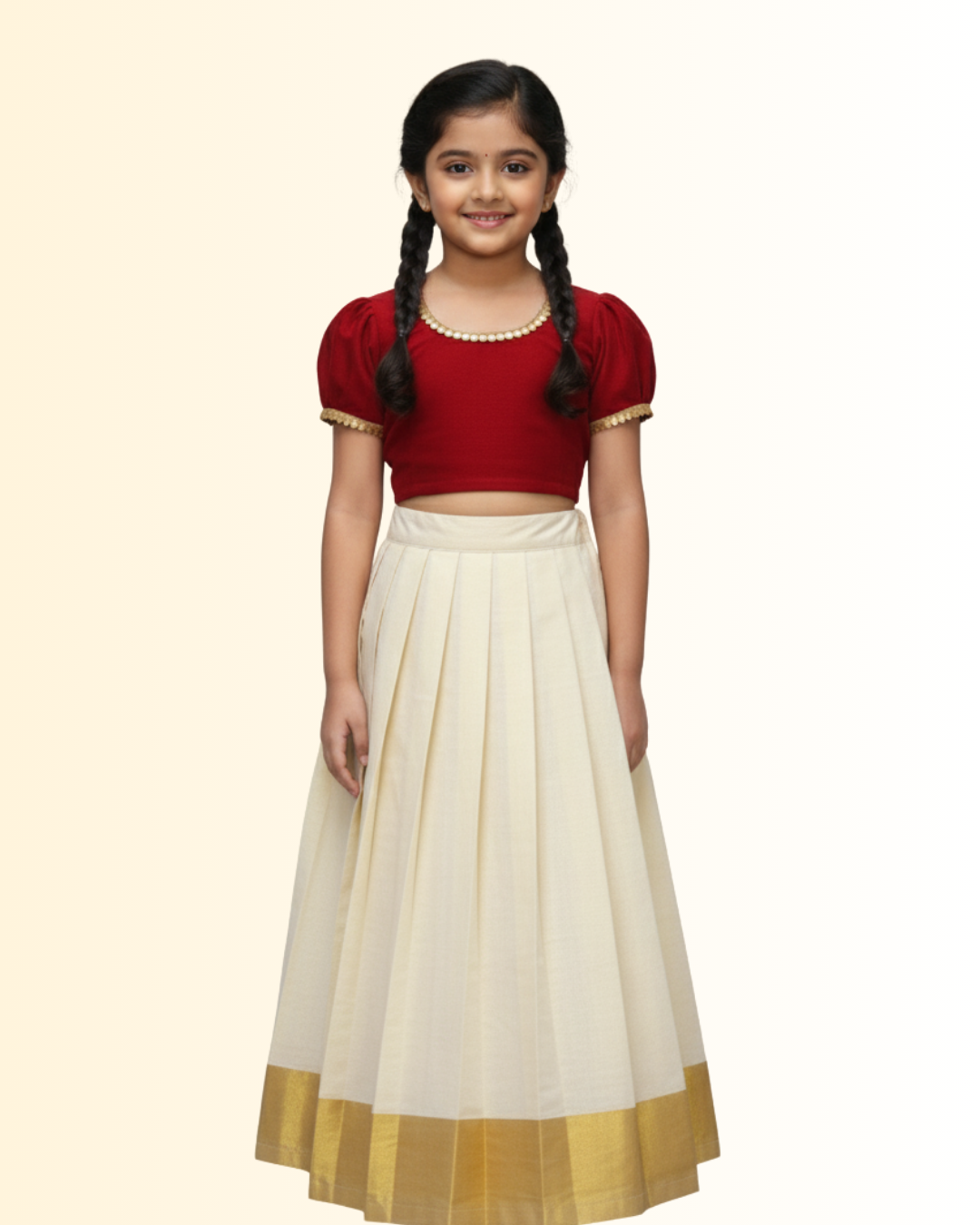 A traditional kasavu set featuring a golden zari-bordered skirt paired with a maroon puff sleeve crop top. The skirt is lined with soft cotton for comfort, while the cotton top adds a charming festive touch. Perfectly blending elegance and ease, this outfit is ideal for Onam, weddings, and cultural occasions — a beautiful balance of tradition and style for your little one.