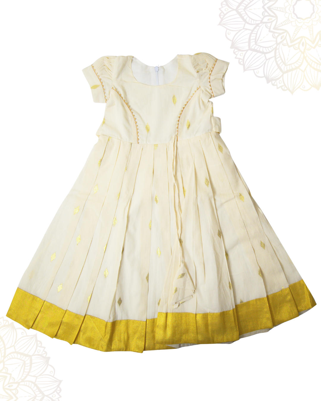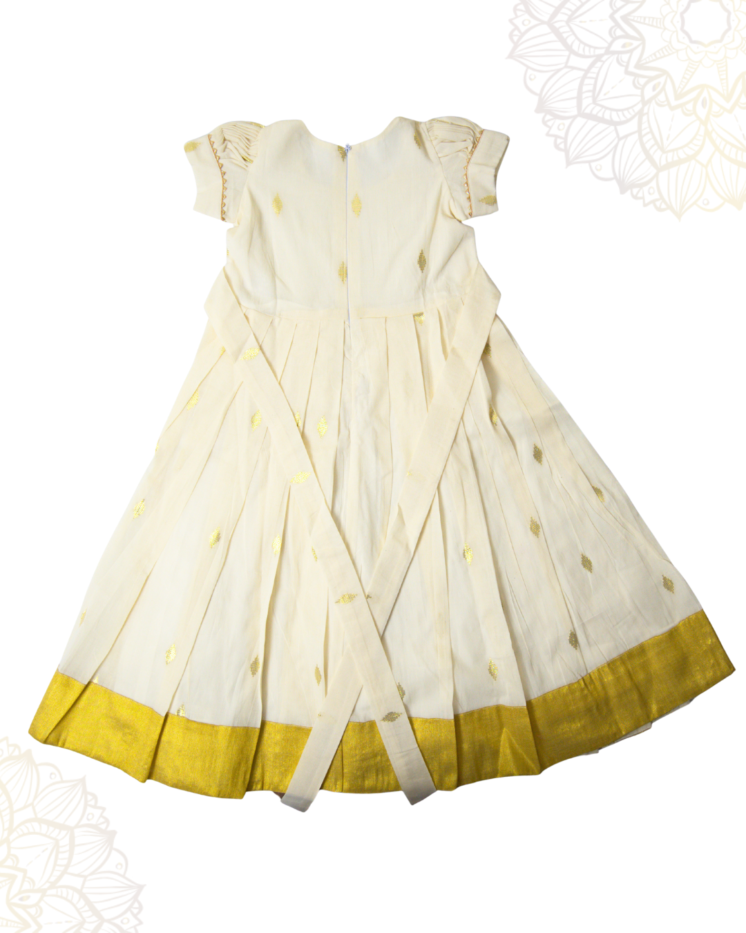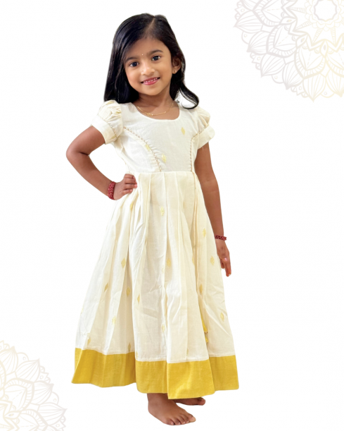 Golden Diamond Butta Kasavu Long Frock with Puff Sleeves