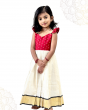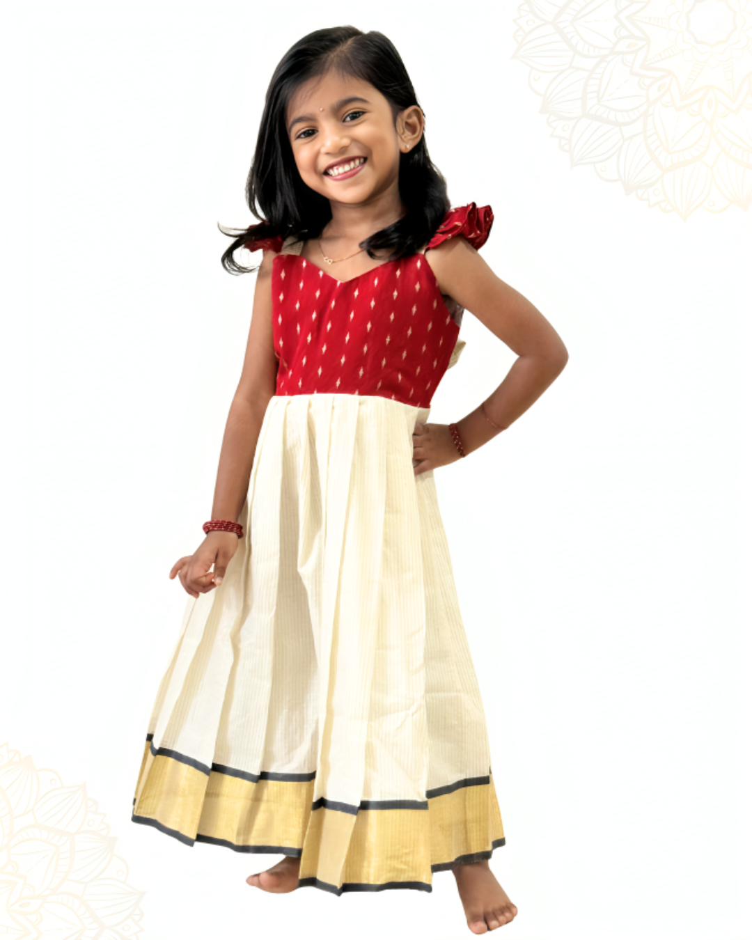 A charming Kasavu frock featuring a maroon butta cotton fabric on the chest, paired with elegant ruffle sleeves for a festive look. Designed with a soft cotton lining, it ensures comfort along with traditional elegance. Perfect for festivals, weddings, and cultural occasions.