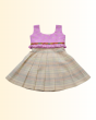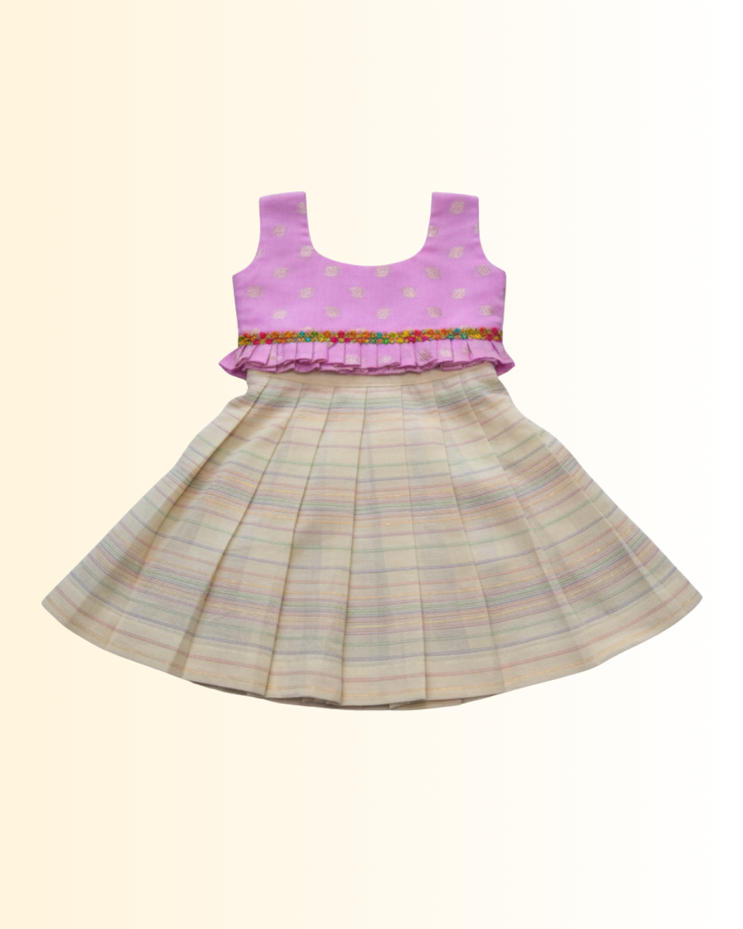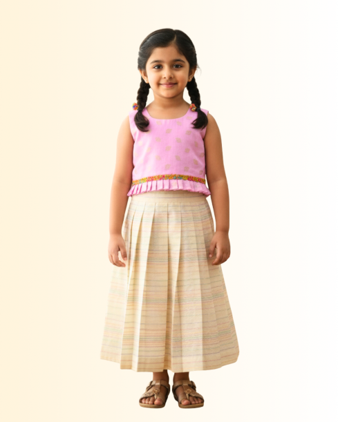 A beautiful festive set featuring a checked tissue kasavu skirt with a soft cotton lining, paired with a sky blue brocade sleeveless crop top. The crop top is lined with cotton for comfort and detailed with delicate lace, adding a charming touch of elegance. Perfect for traditional occasions, cultural festivities, and celebrations, this outfit brings together heritage-inspired design and modern comfort for your little one.