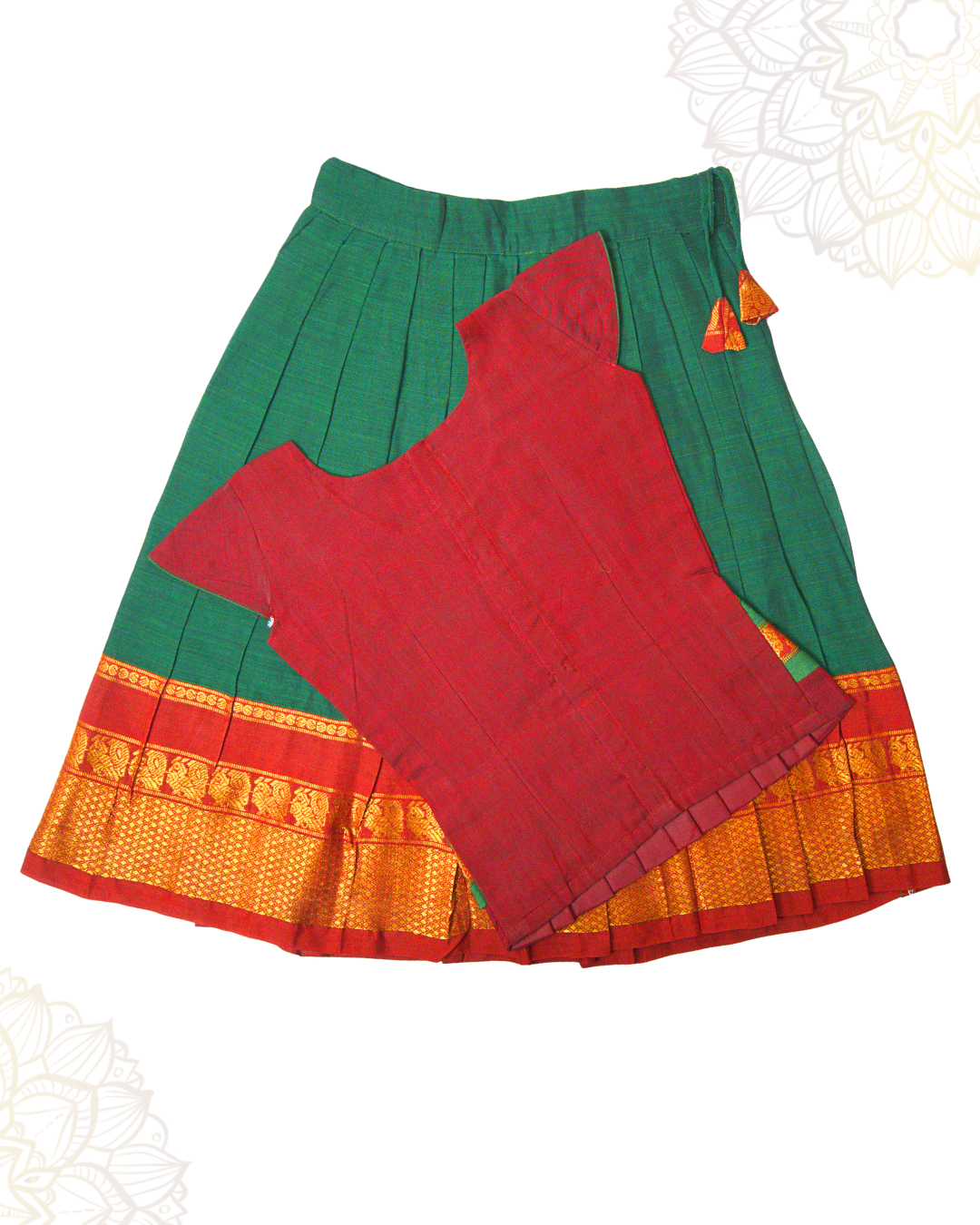 A regal festive outfit featuring a Maroon Narayanpet skirt with a shimmering golden zari border, paired with a Bottle Green top. The top is elegantly designed with frills at the waistline and classic cap sleeves, adding a delicate touch. Inner cotton lining is provided for both the skirt and top, ensuring all-day comfort for your little one. Perfectly blending traditional artistry with modern flair, this set is ideal for festivals, weddings, and special occasions.