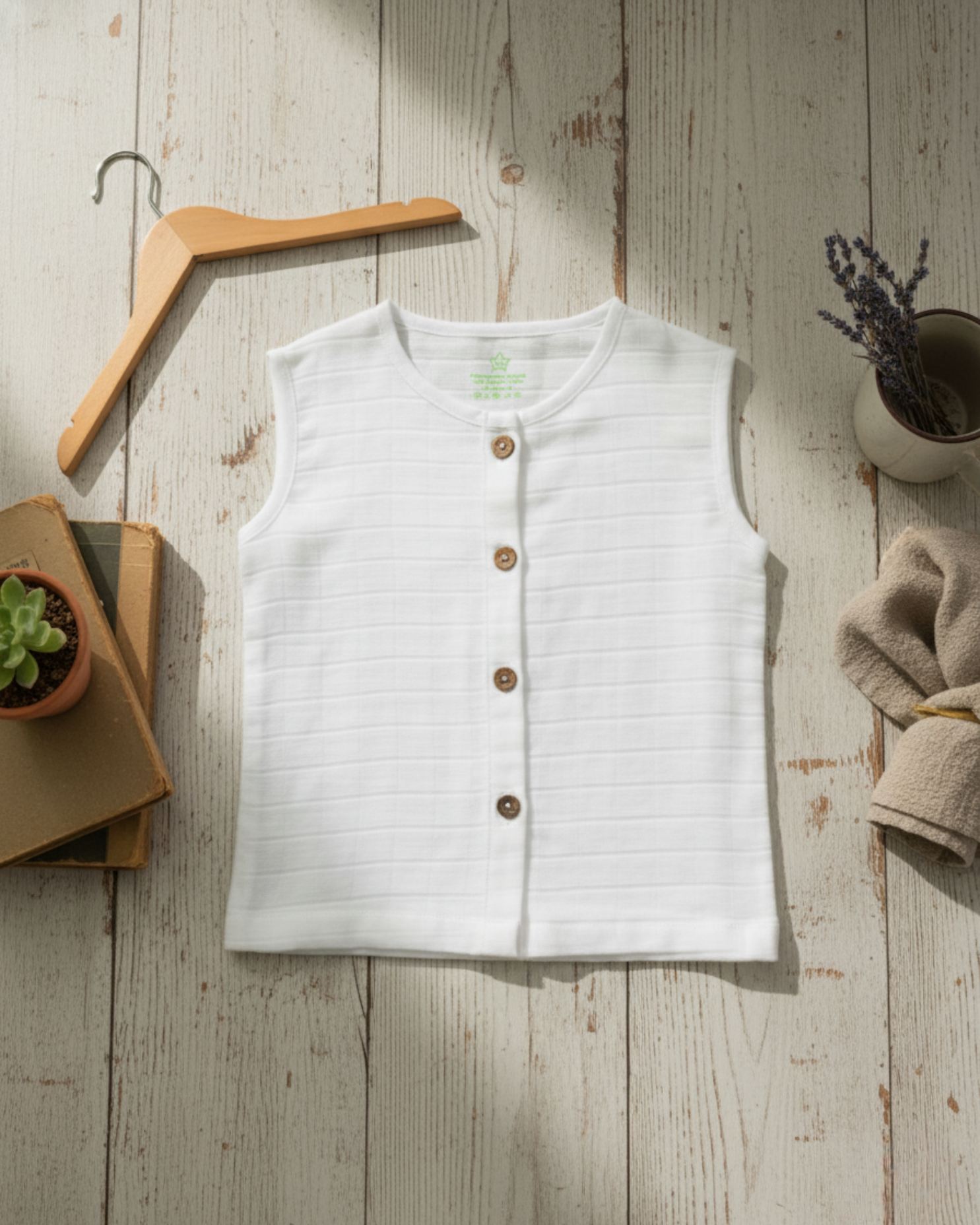 Keep your little one cool and comfortable this summer with our White Organic Cotton Muslin Unisex Jabla. Crafted from 100% pure organic cotton, this lightweight and breathable jabla is designed to let your baby’s skin breathe while ensuring all-day softness. The natural muslin fabric feels gentle and soothing, making it perfect for delicate baby skin. Ideal for playtime or everyday wear, this eco-friendly piece offers a relaxed fit that combines comfort, simplicity, and sustainable care.