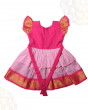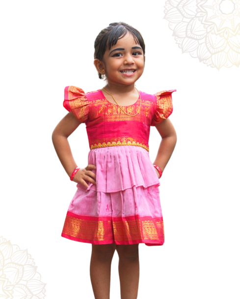 A delightful Kalyani cotton frock in pink and pastel pink, featuring elegant golden lace detailing on the chest. The two-layer design adds volume and grace, while the soft cotton lining ensures all-day comfort. A perfect choice for festivals, weddings, and special occasions, blending tradition with style.