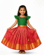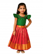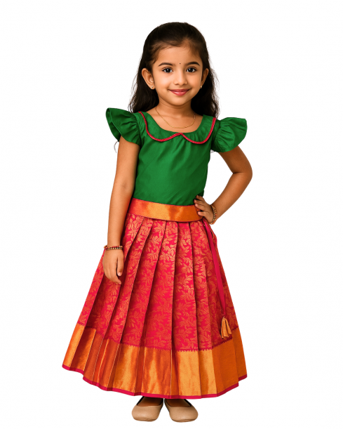 Bring elegance and charm to your little one’s wardrobe with this semi-silk green top featuring delicate ruffle sleeves and a Peter Pan neckline, paired with a semi-silk pink skirt with rich woven detailing. This ensemble beautifully blends tradition with a touch of modern style, making it a graceful choice for festive celebrations.