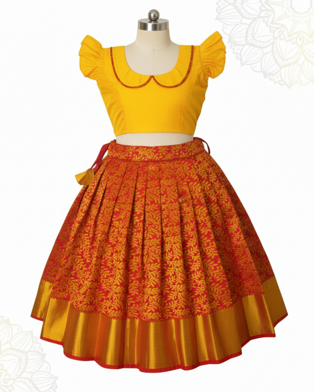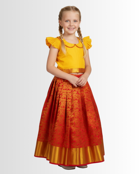 ✨ Semi Silk Yellow Ruffle Sleeve Top with Maroon Skirt – Festive Elegance