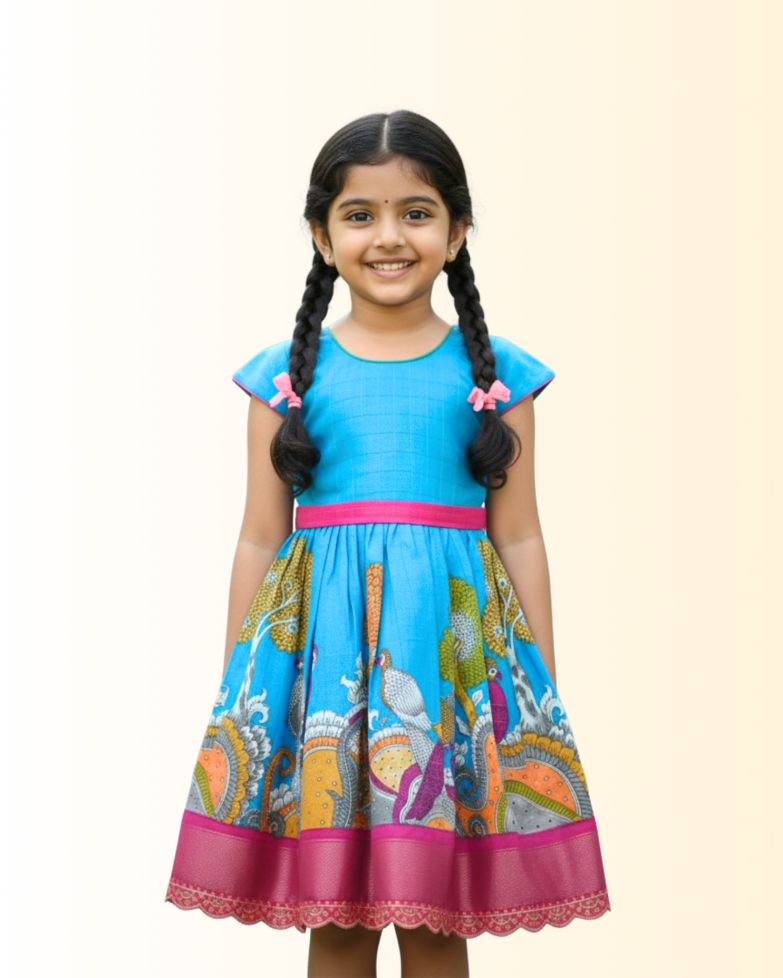 Grace meets tradition in this sky blue silk-cotton long ethnic frock, adorned with scallop lace detailing at the hem and a traditional bird & tree print. Lightweight, elegant, and festive—perfect for weddings, cultural functions, and special occasions.