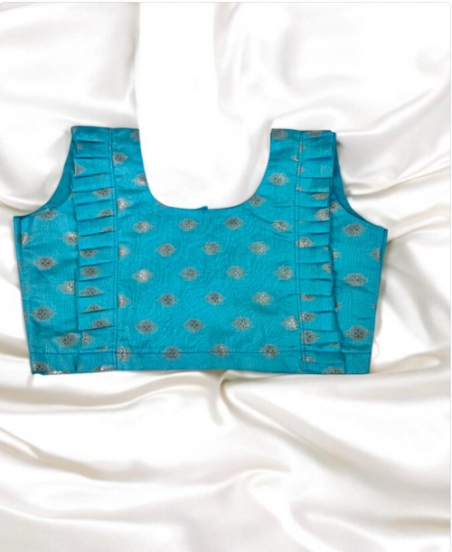 This sky blue brocade sleeveless crop top for kids features a chic back-open design and beautiful frills on both sides for a touch of charm. Perfect for any festive occasion, this versatile top can be paired with any ethnic bottom of your choice to create a stylish and complete look.