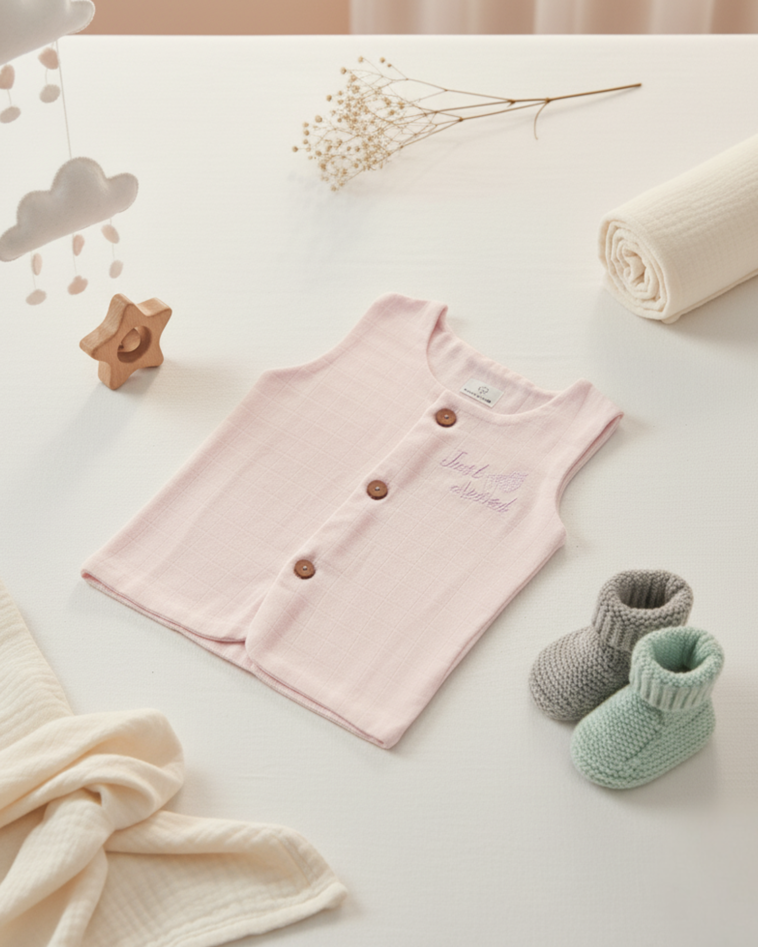This unisex jabla is crafted from 100% soft muslin cotton and features a double-layered design for extra comfort. With elegant embroidery on the left chest, it’s a stylish and breathable choice for summer. The sleeveless design keeps your little one cool while ensuring maximum comfort on warm days.